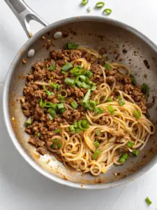 Add the cooked noodles to the skillet, tossing them in the sauce until every strand is coated. Stir in the ground beef, ensuring everything is evenly mixed. For a final touch, sprinkle some red pepper flakes or green onions on top.