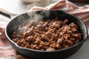 - Cook the steak for 3–4 minutes, breaking it apart with a spatula to avoid clumping.